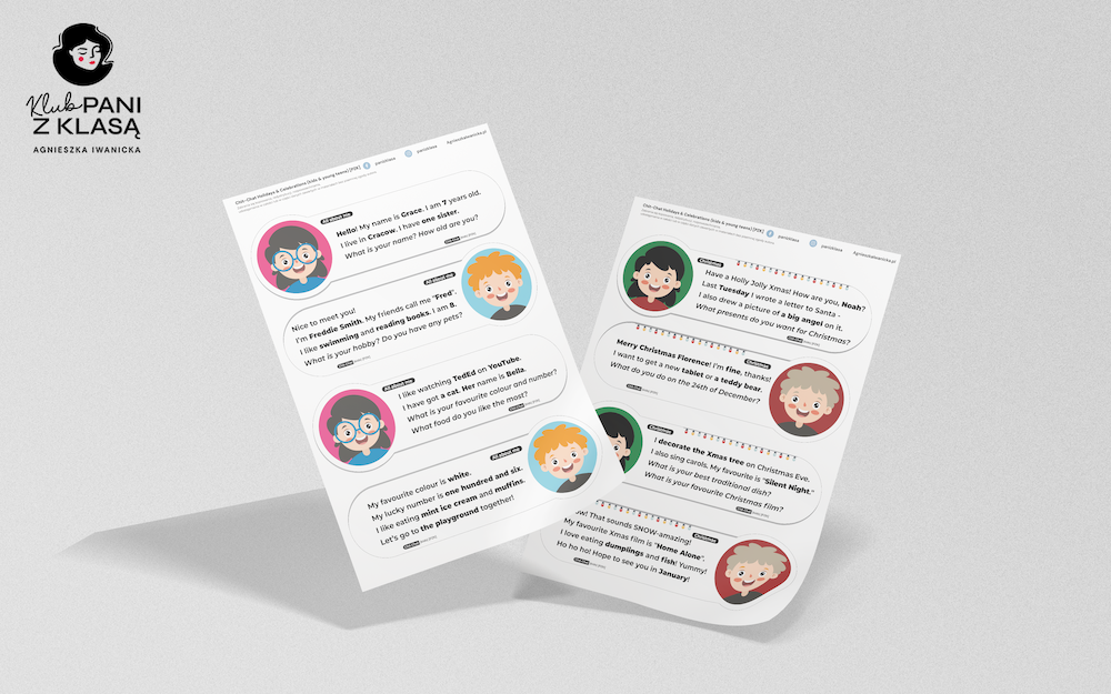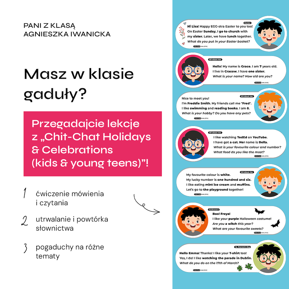 Pogaduchy z „Chit-Chat Holidays & Celebrations (kids)” pozwolą paplom w Twojej klasie porozmawiać o wszystkim – Christmas, Halloween, Easter i St. Patrick’s Day! Albo o sobie, jeśli Twoje gaduły wolą opowiadać All about me 😜