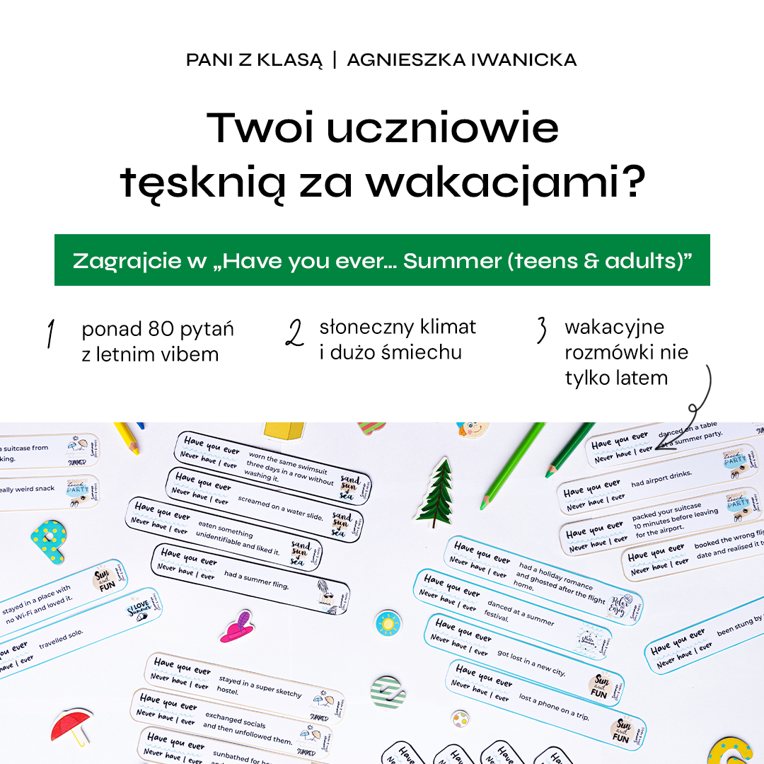 Have you ever…? / Never have I ever – Summer Edition” sprawdzi się idealnie na pierwsze lekcje po wakacjach, letnie kursy, zajęcia konwersacyjne lub po prostu wtedy, gdy chcesz wprowadzić odrobinę słońca i dobrej energii do klasy.