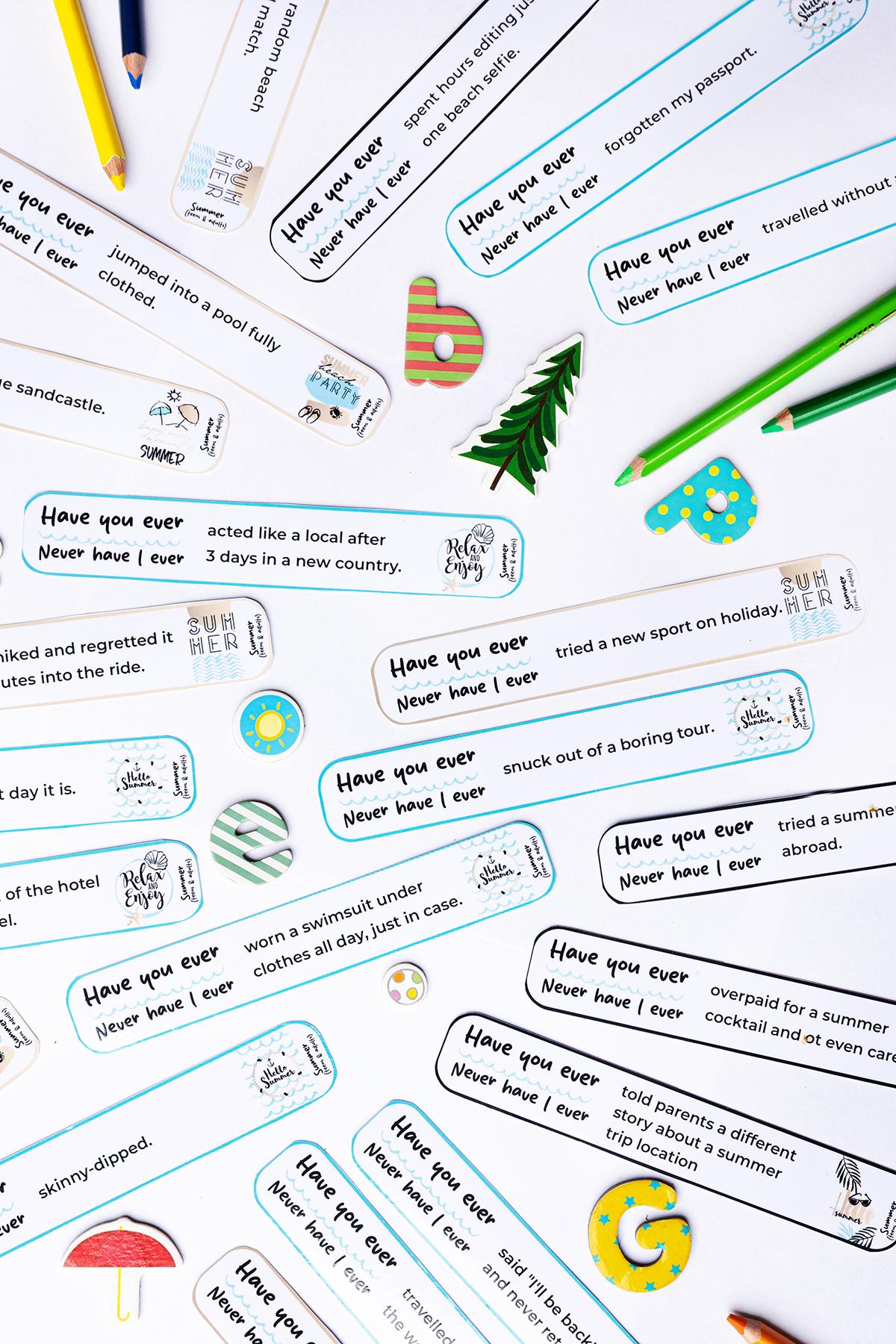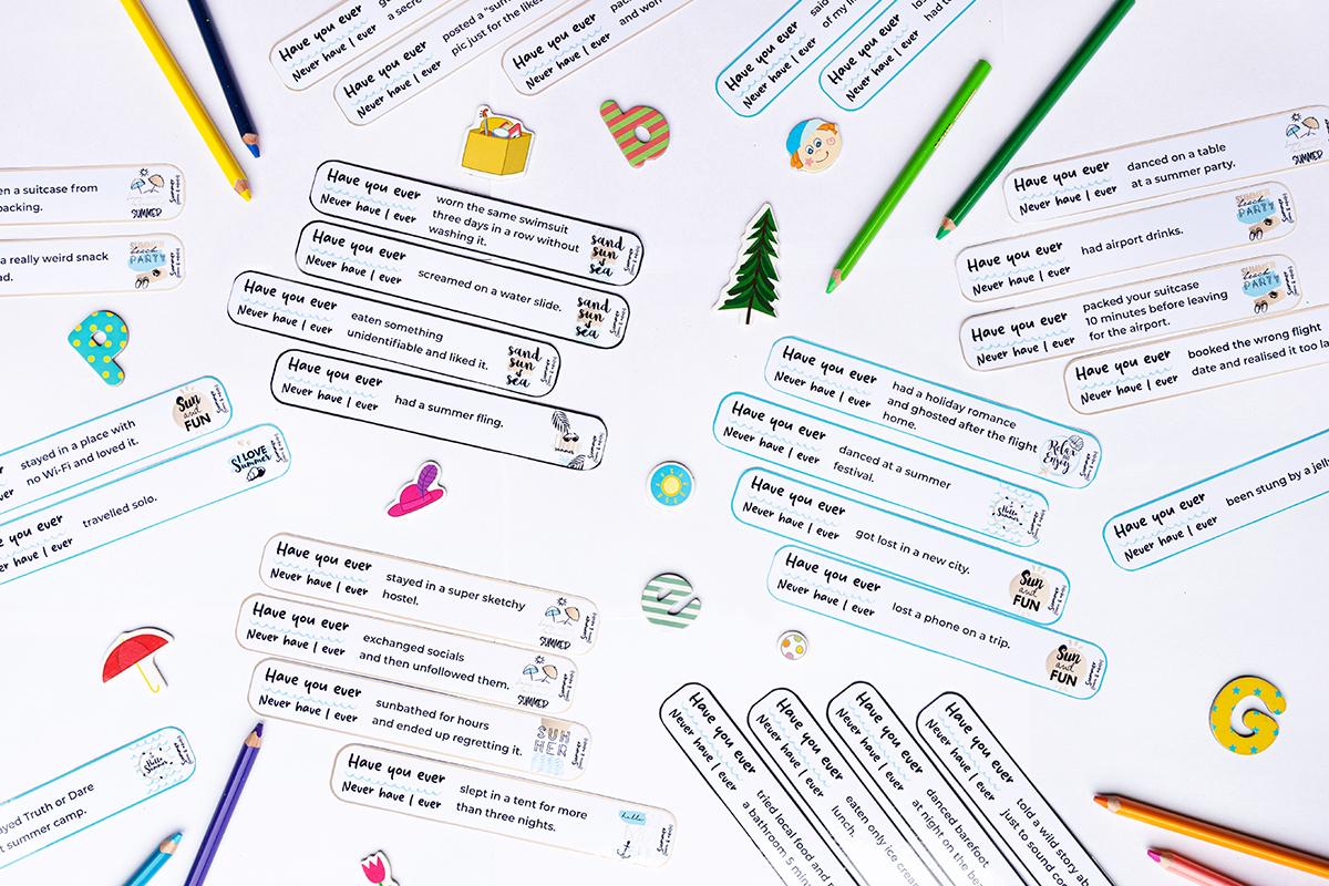 To zestaw pytań i stwierdzeń w formie pasków, które przeniosą Twoich uczniów w letnie wspomnienia i marzenia. „Have you ever…?” i „Never have I ever…” to klasyczna formuła znanej gry, która świetnie sprawdza się na lekcjach konwersacyjnych, zajęciach integracyjnych czy jako przerywnik w ciągu roku szkolnego – nie tylko latem!