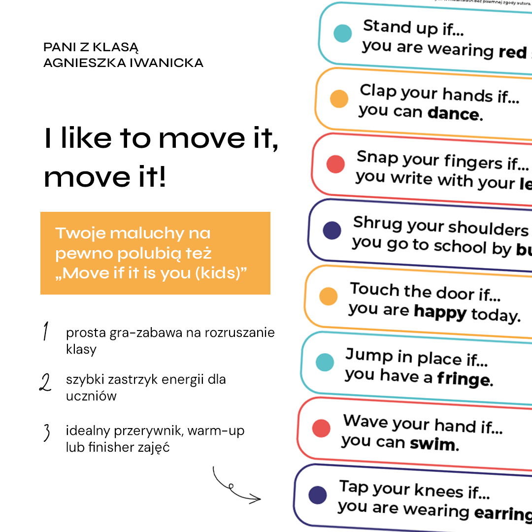 Z grą „Move if it is you (kids)” bez problemu rozruszasz uczniów na początku, w przerwie lub pod koniec lekcji. Albo po prostu pobawisz się z maluchami, kiedy będą potrzebować bardziej dynamicznych zajęć 🤪