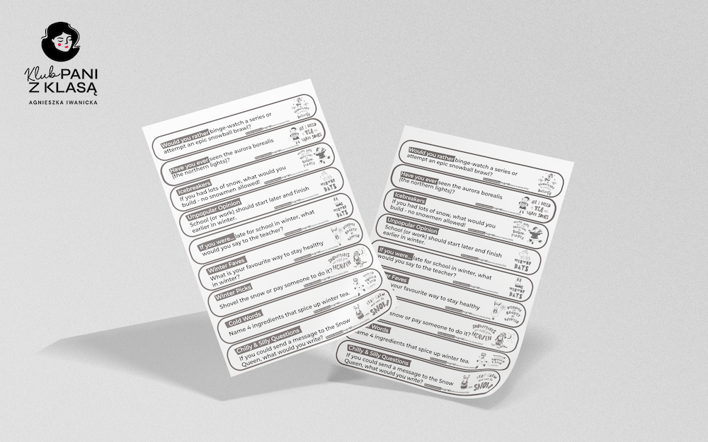 Kategorie pytań w zestawie: ❄️ Would you rather… ❄️ Have you ever… ❄️ If you were… ❄️ Chilly & Silly Questions ❄️ Winter Picks ❄️ Cold Words ❄️ Unpopular Opinions ❄️ Winter Faves. ❄️ Icebreakers Efekt? Więcej mówienia, więcej autentycznych reakcji i zimowa lekcja, która naprawdę „sunie” (jak sanki po śniegu).
